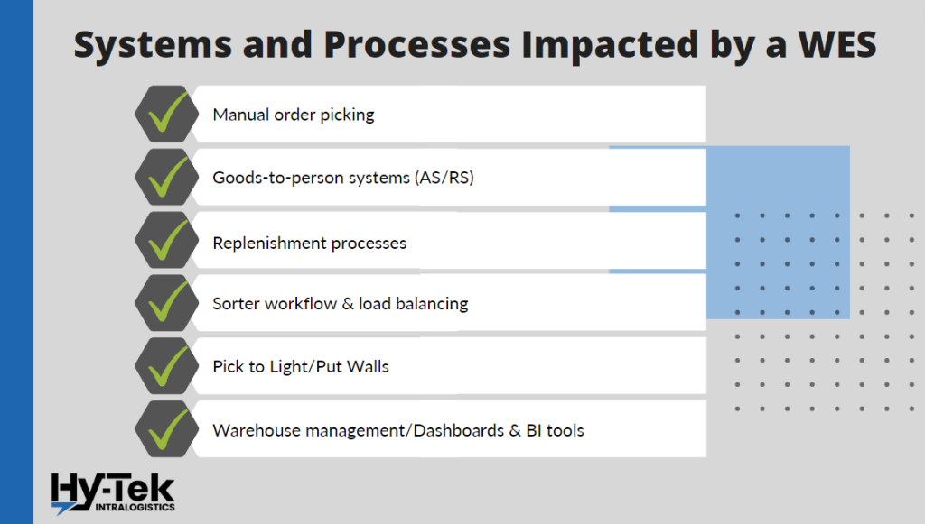 - Some WES solutions may also incorporate some or all Warehouse Control System (WCS) functions, including MHE controls and visibility